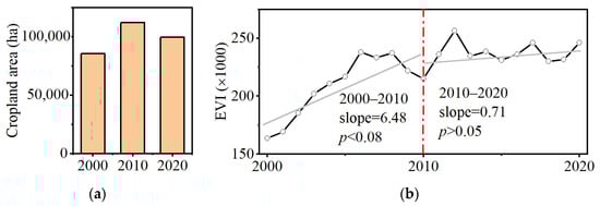 (a) The coverage of cropland area outside of the protected area, and (b) the interannual variations in cropland EVI outside of the protected area from 2000 to 2020.
