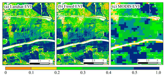 The spatial comparison of (a) Landsat EVI, (b) fused EVI, and (c) MODIS EVI in a specific region (The Landsat data correspond to the 231st day of 2019, while the MODIS data correspond to the 233rd day of 2019. Latitude: 37°44′8.63″–37°52′53.24″; longitude: 118°52′2.29″–119°0′47.73″).