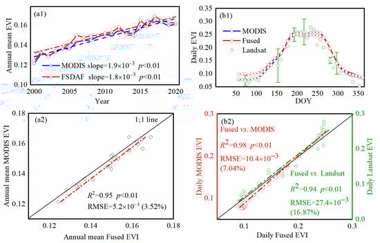 The interannual and seasonal dynamics of the fused EVI and MODIS EVI: (a1) the interannual trends of the fused EVI and MODIS EVI in the YRD from 2000 to 2020; (a2) the relationships between the annual fused EVI and MODIS EVI in the YRD from 2000 to 2020; (b1) the seasonal variations in the fused EVI, MODIS EVI, and Landsat EVI of the multiyear average EVI; (b2) the relationships between the seasonal fused EVI and seasonal MODIS EVI, as well as between the seasonal fused EVI and seasonal Landsat EVI. The dashed lines in the graph represent the linear regression lines.