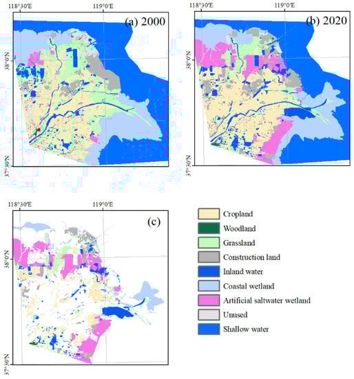 The land use and land cover changes in the YRD from 2000 to 2020. (a,b) show the land cover and land use in 2000 and 2020, respectively. (c) indicates the newly added areas of each land use type. Furthermore, climate change played a significant role in the vegetation variations observed in the YRD. Previous research has indicated that temperature is a key driving factor for spring and autumn vegetation growth, while precipitation is an important hydrological factor affecting vegetation growth, besides the impact of runoff []. This study demonstrates the enormous potential of multisource remote sensing data fusion methods for the monitoring of vegetation changes in estuarine wetlands. The research methodology can be applied in global and regional estuarine wetlands, as well as areas with complex land surface coverage.