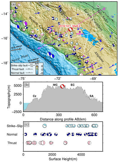 (a) Geological map around the 2016 Mw 6.2 Juliaca earthquake. White arrows represent the convergence rate of the Nazca Plate relative to the South American Plate []. Blue arrows show the GPS observations []. Purple triangles are active volcanoes []. White boxes outline the spatial coverage of the Sentinel-1A SAR images. All the crustal earthquakes (Mw > 5) with depths < 80 km from 1976 to 2016 in the overriding plate are shown. The light blue, dark blue, and pink beach balls represent normal, strike-slip, and thrust faulting earthquakes, respectively. The red beach ball indicates the focal mechanism of the 2016 Juliaca earthquake. The black beach balls from north to south denote the 1942 Mw 8.1 earthquake, the 1996 Mw 7.7 earthquake, 2001 Mw 8.4 earthquake, and 2001 Mw 7.6 earthquake near the subduction zone. Except for the focal mechanism of the 1942 earthquake acquired from the reference [], all the focal mechanisms are obtained from the GCMT (https://www.globalcmt.org/CMTsearch.html, accessed on 13 July 2023). UACC F. S: Urcos-Ayayiri-Copacabana-Coniri Fault System; VN: Vilcanota Fault; CZ: Cuzco Fault System; MN: Manu thrust fault. (b) Topographic profile along AB marked by the dashed magenta line in (a). Cz: Coastal zone; WC: Western Cordillera; EC: Eastern Cordillera; SA: the sub-Andean fold and thrust belt. (c) Crustal earthquake mechanism versus surface height.