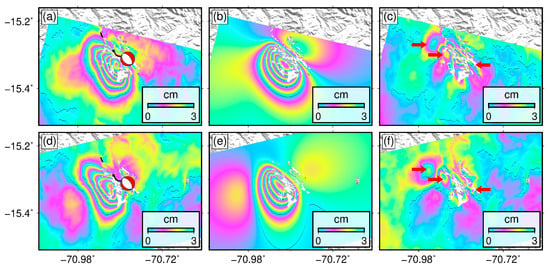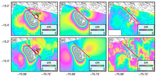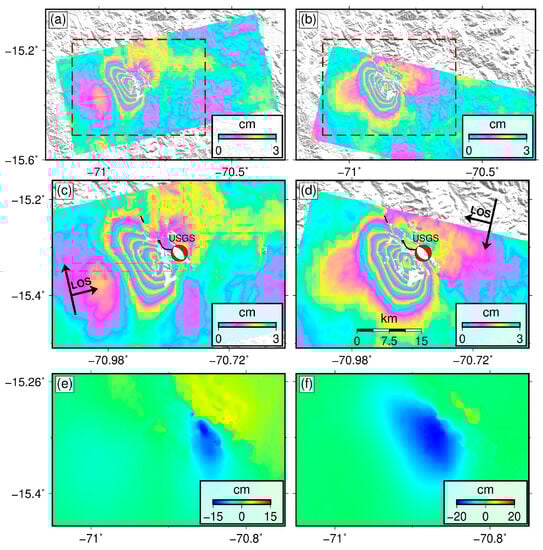 (a,b) are the coseismic interferograms from the ascending track 149 and descending track 127, respectively. The two dark-red dotted boxes represent the areas in (c,d), respectively. The thin black lines in (c,d) represent the surface rupture traces acquired by field investigation []. The red beach ball represents the focal mechanism solution of the 2016 Juliaca earthquake. (e,f) are the acquired coseismic quasi-east-west and quasi-vertical deformations, respectively.