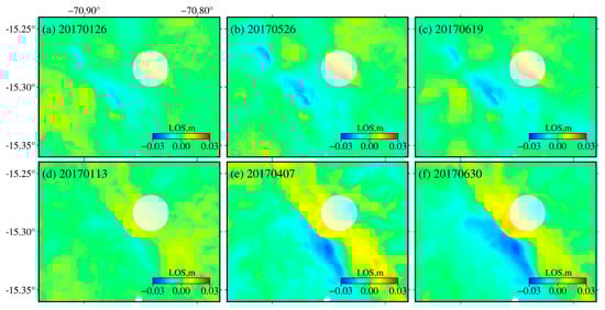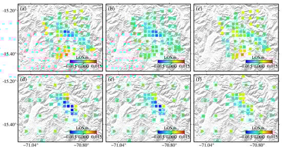 To obtain the postseismic deformation related to the 1 December 2016 Juliaca earthquake, seven Sentinel-1A ascending images spanning the time period from 9 December 2016 to 19 June 2017 and twelve descending images spanning the time period from 20 December 2016 to 30 June 2017 are used (Table 3). We first use the same method to process all the postseismic interferometric pairs as the coseismic interferogram and then apply the MintPy package to acquire the following InSAR time series by means of the small baseline method [,,]. The processing results (Figure 3) exhibit one significant deformation area located at the up-dip region of the greatest coseismic deformation gradient. The cumulative postseismic LOS displacements in the ascending and descending interferograms are up to ~−1.8 cm and ~2.5 cm, respectively, for the 2016 Juliaca event.