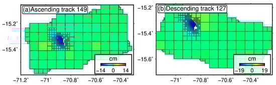 To improve the inversion efficiency, we use the quadtree method to downsample the coseismic deformation of the 2016 Juliaca earthquake (Figure 4). In addition, we apply the empirical errors of these two interferograms obtained from the 1D covariance function to set the weight ratio of the ascending and descending SAR data to be 1:0.987 []. On the basis of the rectangular dislocation model [], the fault geometrical parameters and the detailed coseismic slip distribution of this earthquake were obtained by InSAR observations. An open inversion package called PSOKINV [] is used to invert for the fault parameters of the one-segment model with a two-step method. First, a nonlinear inversion algorithm is applied to obtain the fault geometric parameters by minimizing the square misfit under the hypothesis of uniform slip on a rectangular fault; then, a linear inversion algorithm is applied to acquire the detailed slip distribution on the determined fault plane.