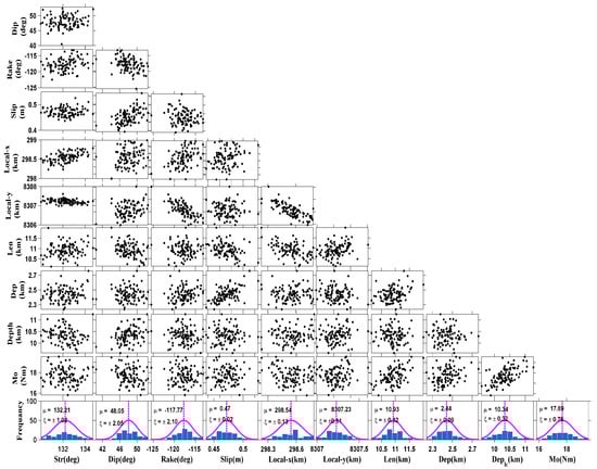 The fault geometry parameters, consisting of fault length, fault width, buried depth, dip, strike, rake, and location, are acquired by minimizing the squared misfits between the observed and modeled coseismic surface deformation []. According to the coseismic interferograms of the 2016 earthquake (Figure 1), field investigation [], and focal mechanism solutions provided by both USGS and GCMT (Table 1), the strike of the rupture fault is constrained between 114° and 154° during the inversions. The uncertainty of fault geometrical parameters is evaluated by means of the Monte Carlo method []. Model solutions from 100 simulations disturbed by noise in statistical properties based on the one-dimensional covariance functions are applied to obtain the standard deviation from their distributions (Figure 5). The optimal fault parameters and standard deviations of all final solutions from inversion are shown in Table 1. Our uniform slip model shows that the rupture fault has a dip of ~48° and a strike of ~132°, with a width of ~10.7 km and a length of ~10.9 km. The uniform slip reaches up to 0.47 m and the rake is determined to be ~−118°. The inverted geodetic moment magnitude is Mw 6.13, which is slightly smaller than the GCMT result and the USGS result. As a whole, our optimal fault geometrical parameters are basically consistent with the two previously published studies [,] and are relatively stable (Figure 5). Figure 6 shows the modeling results for the uniform slip model. The acquired uniform slip model fits the observed interferograms well except in the epicenter area, where relatively large residual fringes still exist (Figure 6c,f). The root-mean-square error (RMS) between the observed and modeled values is 5.2 mm and 4.5 mm for the ascending track and the descending track, respectively.