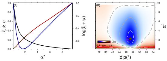 (a) A trade-off line related to the slip distribution model with a dip of 50.6°. The red and black lines represent the trends of the model roughness and residuals, respectively. The blue line shows log (ξ + ψ). (b) Contour map of log (ξ + ψ) with different dip angles and smoothing factors. Red star represents the global minimum.