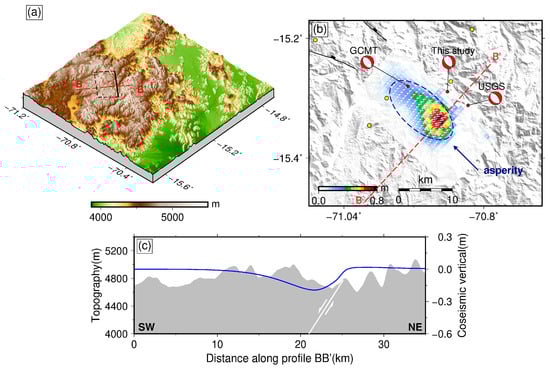 On 1 December 2016 (UTC Time 22:40:26), an Mw 6.2 earthquake occurred approximately 77 km northwest of Juliaca, the capital of San Roman Province in the Puno Region of southern Peru (Figure 1a). As the largest shallow event to occur in the high Andes of southern Peru, the Juliaca earthquake led to three casualties and damaged at least 130 houses [,]. After the earthquake, only seven aftershocks (Mw > 2.5) followed within 15 days of the mainshock, according to the United States Geological Survey (USGS). The largest aftershock had a magnitude of Mw 4.8, and the epicenter of the mainshock was at 70.827°W and 15.312°S at a depth of 12 km (Table 1). The focal mechanism solutions of the mainshock from the USGS and Global Centroid Moment Tensor (GCMT) imply that this earthquake ruptured either a nearly SE-trending fault with a predominantly normal mechanism or a nearly NW-trending normal fault (Table 1). The occurrence of the December 2016 event provides a unique opportunity to improve our knowledge of the regional tectonic deformation and the seismogenic mechanism of the shallow normal-faulting earthquake with modern geodetic datasets. In preliminary geodetic analysis, the authors of the reference [] utilize the coseismic InSAR observations to invert the fault geometry of the 2016 earthquake and support the activation of the SE-striking normal fault. However, they do not further investigate the detailed coseismic slip and postseismic afterslip distribution but focus more on the dynamics of the Andes on a large scale. By contrast, the authors of the reference [] carry out the relatively detailed coseismic and postseismic modelings related to the 2016 earthquake and also believe the SE-striking normal fault to be the seismogenic fault responsible for the 2016 earthquake. Although the two previously published studies contribute to a deep understanding of the tectonic deformation, seismogenic fault of the 2016 earthquake, and dynamics of the high Andes, they ignore an in-depth analysis of the seismogenic mechanism, the relationship between this event and nearby historical earthquakes, and the detailed stress changes associated with the surrounding mapped active faults.