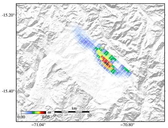 Poroelastic rebound, afterslip, and viscoelastic relaxation are believed to be the three main mechanisms responsible for postseismic deformation (e.g., []). Given the short-period, localized postseismic deformation and shallow depth of the 1 Decenber 2016 Juliaca earthquake, we assume that the identified postseismic deformation is dominated by afterslip. To acquire the detailed afterslip distribution, we perform an inversion with cumulative deformation (Figure 3). Herein, we assume that the afterslip occurred on the same seismogenic fault plane as the coseismic rupture. The result (Figure 10) reveals that the afterslip is mainly characterized by normal faulting and that most of the slip is confined at depths between 0 and 5.4 km, peaking at ~0.05 m at a depth of ~3.8 km. The relatively shallow postseismic afterslip makes up for the coseismic slip deficit area to some extent (Figure 8b and Figure 10). The acquired afterslip distribution can fit the postseismic observation well (Figure 11). The cumulative moment due to afterslip is ~7.5 × 1016 Nm, corresponding to an Mw 5.2 earthquake.