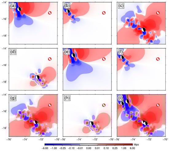 Coulomb stress changes at the epicenter of the 2016 earthquake. (a–d) are coseismic Coulomb stress changes for events A–D, respectively. (e–h) are the sum of the coseismic and postseismic stress changes for events A–D, respectively. (i) is the Coulomb stress accumulation state after the four events. The black beach balls represent the focal mechanism solutions of the events A–D while the red beach ball represents the focal mechanism solutions of the 2016 Juliaca event.