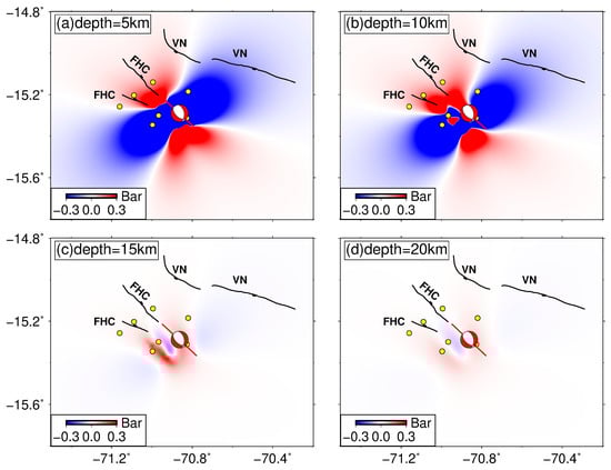 Coseismic Coulomb stress changes induced by the 2016 Juliaca earthquake. (a–d) are the Coulomb stress changes at depths of 5 km, 10 km, 15 km and 20 km, respectively. The red line represents the seismogenic fault of the 2016 event. Black lines with a black box are normal faults. FHC: Falla Huaytacucho-Condoroma fault from the SARA database (https://sara.openquake.org/, accessed on 13 July 2023).