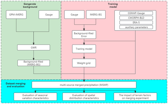 The experimental scheme of this study is mainly divided into three parts: (1) Determining the initial background field. After evaluating the accuracy of the original observation data, this study selects the appropriate precipitation data as the background field, corrects it with the gauge data, and finally obtains the background field with a higher accuracy of 0.1° resolution. (2) Model training. The error between gauge data and the initial background field is the output of a model. The precipitation data of other satellites, reanalysis precipitation data, and auxiliary parameters are input, and the relative weight of each precipitation datum is calculated, predicting the weight matrix in the other grids without a station. (3) Data merging. Combined with the weight matrix obtained by the above method, multi-source precipitation data and auxiliary parameters are used to adjust the initial background field.