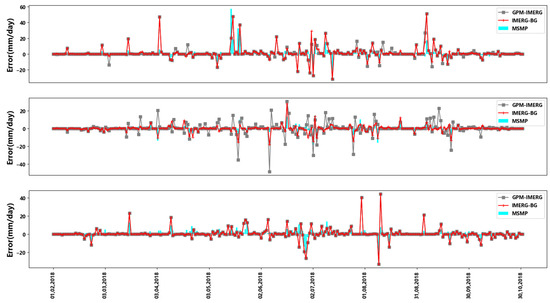 In order to explore the change of actual precipitation with merging precipitation data, this study selects a national meteorological station in each of the three research areas to study the change of precipitation at a single station from 1 February 2018 to 31 October 2018. Figure 5 compares the error changes of the three kinds of precipitation data (GPM-IMERG, IMERG-BG, MSMP) in three national meteorological stations. It can be seen that, after the calibration of the GPM-IMERG satellite data with the gauge data and the multi-source merging experiment, the difference between the satellite precipitation and the gauge precipitation decreases significantly. The variation trend of the difference over time does not change significantly, indicating that the correction of satellite data in this study is only the corresponding error correction of the precipitation value. It makes it closer to the gauge data but does not change the temporal variation characteristics of the original precipitation data.