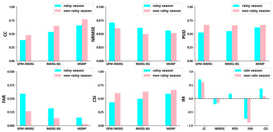 Figure 6 shows the evaluation results of the three kinds of precipitation data in the merging experiment in the rainy season (June to September) and non-rainy season (February to May) of 2018. Among them, the IM index represents the accuracy improvement of the MSMP data in each evaluation index compared with the GPM-IMERG data. It can be seen that, under the quantitative evaluation index, the evaluation performance of satellite data in the rainy season is weaker than in the non-rainy season. After the multi-source merging experiment, the difference in evaluation performance is slightly improved. The multi-source merging experiment has a better effect on improving the accuracy of the satellite observation data during the rainy season. However, on the whole, the multi-source merging precipitation data achieve stronger detection of precipitation information during the non-rainy season.