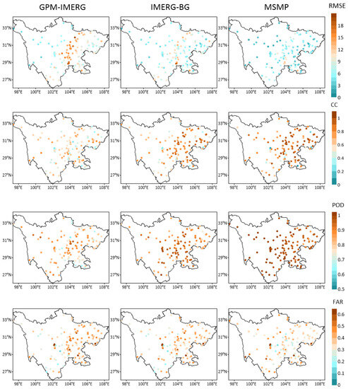 Accuracy evaluation of the GPM-IMERG, IMERG-BG, and MSMP precipitation datasets at 130 stations.