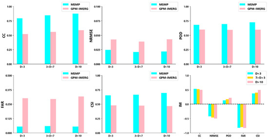 The conventional multi-source merging method is based on multiple regression analysis of gauge data. The effect of the merging experiment often depends on the distribution density of the stations in the study area, and the merging experiment is relatively better in the area with dense stations. In this study, the random forest algorithm is used to conduct the multi-source precipitation merging experiment, and the merging model is built according to the relationship between the precipitation observed by satellites and gauge data, which is relatively less dependent on the station density of the data. In order to verify this phenomenon, in the research area with an elevation of less than 1000 m, the accuracy of the original satellite data and the multiple merging data are evaluated according to the station density D (the number of stations in the 0.1° grid), that is, D < 3, 3 < D < 7, and D > 7. The results are shown in Figure 10, where the IM index of the multi-source merging precipitation data improves compared with the original satellite data under various indicators. It is not difficult to see that, no matter the research area, precipitation data has better performance under various evaluation indicators after the multi-source precipitation merging experiment. It can be seen that there are minor differences in different station density regions, which may be because the MSMP data are obtained based on the initial background field, which is obtained by correcting the original satellite data using the gauge data. The correction effect may be affected by the distribution density of the stations, but the impact is negligible. Therefore, the station density also affects the final experiment effect less.
