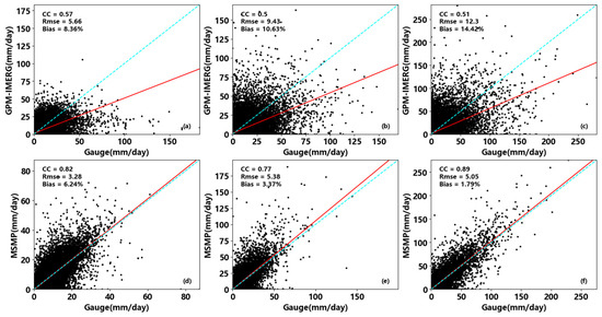 (a–c) are the regression analysis of GPM-IMERG datasets and gauge data in study area III, II, I; (d–f) are the regression analysis of MSMP datasets and gauge data in study area III, II, I; The blue line represents the ideal regression line, and the red line represents the actual regression line.
