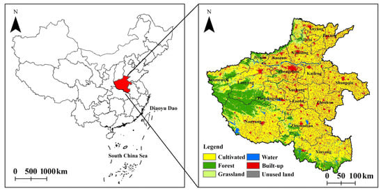 The Henan Province (Figure 1) is in the central region of China, between 31°23′–36°22′N and 110°21′–116°39′E. Its terrain and landforms are diverse and feature extensive vegetation coverage. The province spans the Yangtze, Yellow, Huai, and Hai River basins, with relatively scarce water resources and various types of natural disasters such as drought, floods, pests and diseases, geological disasters, forest fires, and sudden environmental events. In recent years, the number of geological disasters has significantly increased (766 in 2021) and the number of natural disasters, such as forest fires and sudden environmental events, has also remained high. The urbanization rate in the research area has increased annually since 2013, reaching 50% in 2017. The built-up area has been increasing annually, reaching 3235 km2 in 2021. Urbanization has caused a series of environmental problems, such as ecological damage, resource scarcity, and air pollution, which must be better managed and resolved.