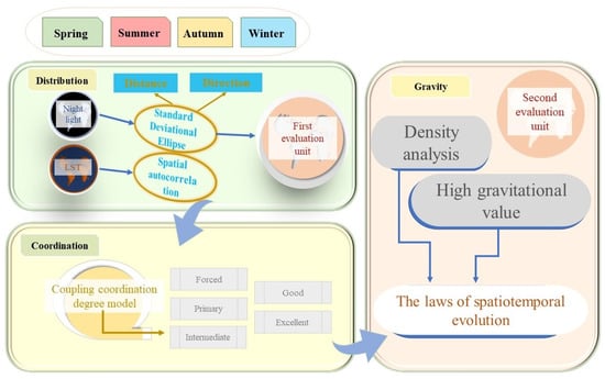 Therefore, this study uses the time nodes of spring, summer, autumn, and winter in the 24 solar terms to divide the daily night light and LST data, extract the LST values with high brightness, and further combine the analysis–coordination–gravity framework to explore the spatial distribution and spatiotemporal variation laws of regional LST gravity. This study provides an important reference for understanding the formation of the heat island effect and regional ecological restoration and governance.