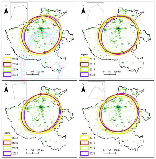 In this study, areas other than those with low light intensity were selected as the first evaluation unit, and the directional distribution of the first evaluation unit was explored using a standard deviation ellipse (Figure 4; the scale of the thumbnail in the upper left corner is inconsistent). Table 1 shows the offset distances of the standard deviation ellipses for the three time periods in the study area, which indirectly indicate the magnitude of nighttime lighting offset. In the first two periods of spring, the offset distance was similar and the offset amplitude was consistent, whereas the offset amplitude significantly decreased in the last period. The shift amplitude in summer was relatively small in the three time periods, with a slightly larger shift amplitude in the first period. The amplitude in the first two periods of autumn was consistent, but a sharp decrease in the shift amplitude occurred in the third period, indicating that the change in the lighting brightness during the autumn period was relatively small. The deviation amplitude in winter decreased from the first to the third period. Overall, the deviation distance and amplitude exhibited significant changes in the first period, whereas the changes in the last period were relatively small. This indicates that the social, economic, and demographic changes in the Henan Province have been relatively small in the past four years compared with those in 2013 and 2016.