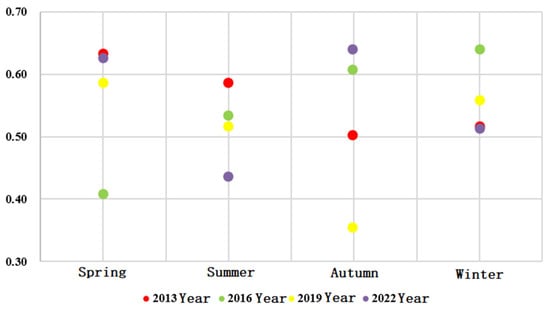 To make reasonable use of the coupling coordination model, spatiotemporal distribution differences in the nighttime lighting brightness values were analyzed (Figure 3). In addition to areas other than those with low nighttime brightness values, the nighttime light was centered around Zhengzhou City and distributed to other prefecture-level cities and counties in the Henan Province. In addition, the nighttime brightness values of cities, such as Pingdingshan, Jiaozuo, Xuchang, and Xinxiang, were high. The nighttime light brightness had a large distribution area in 2013, 2019, and 2022 and the nighttime light in 2013 and 2019 showed a balanced distribution throughout the four seasons, without significant differences. The nighttime lighting brightness was weaker in 2016, especially in autumn and winter. The nighttime lighting brightness in autumn 2022 was slightly weak and gradually increased in winter.