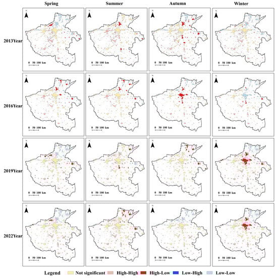 Figure 5 shows the global spatial autocorrelation results. The autocorrelation test for LST under the first evaluation unit in all years yielded Z > 2.58, with a p-value below 0.01 and a positive Moran’s I. This indicates that LST was not randomly distributed and showed a positive autocorrelation at the 99.9% confidence level. The LST trend was the same, and a spatial clustering effect was observed. In 2013 and 2019, Moran’s I first decreased and then increased with seasonal changes, indicating that the aggregation degree of the LST also first decreased and then increased. The degree of aggregation in 2016 gradually increased with the change in seasons and the degree of aggregation in 2022 showed an oscillating evolution pattern. From a seasonal perspective, the degree of LST aggregation in the spring of 2016 was lower than that of the other three years. The degree of LST aggregation in the summer of 2016 surpassed that of 2019 and 2022 and the degree of aggregation in 2013 remained in a leading position. The degree of aggregation in autumn decreased significantly in 2019, with 2022 having the highest degree of aggregation. The Moran’s I values in winter were all greater than 0.5. The year 2016 showed the highest degree of clustering, whereas the other three years had similar degrees of clustering.
