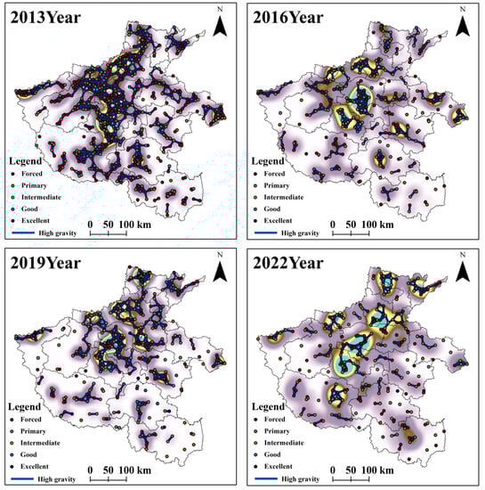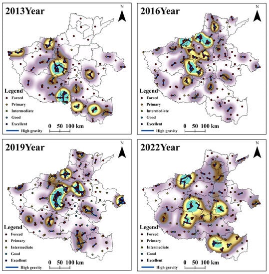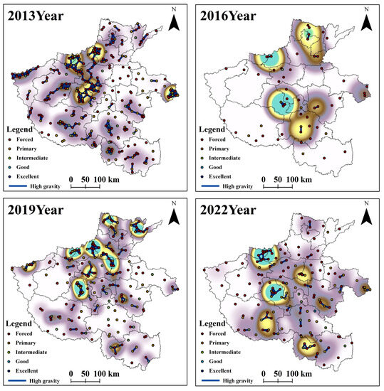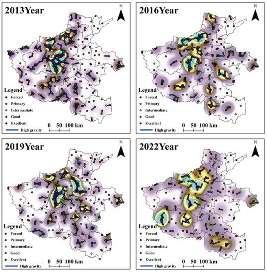 Figure 10 shows the spatiotemporal distribution of the high-gravity LST in winter. The distribution of high-gravity values in winter was denser than that of spring and autumn. In 2013, high-density values were mainly distributed at the junction of Pingdingshan, Xuchang, and Zhengzhou City, whereas other high-gravity values were scattered in the Henan Province. The distribution of high-gravity values in 2016 and 2019 was relatively similar and evenly distributed in the study area. The high-gravity densities of Pingdingshan, Xuchang, Zhengzhou, and other cities maintained their peak values. Although the distribution of high-gravity values in 2022 was relatively uniform, the distribution of high-gravity values gradually became discrete. Due to the relatively low impact of clouds and air humidity on winter solar radiation, the LST decreased. In addition to factors such as sunlight and solar radiation, weather changes, such as snowfall and frost, were also observed. Although the distribution density of the high-gravity values was high, the overall gravity value was low, which was closely related to the overall decrease in the LST.