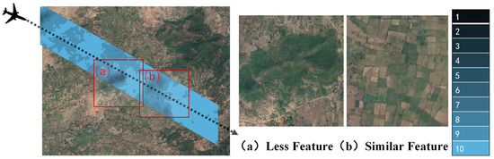 Illustration of the analysis of matchability in reference imagery for aircraft. (a) indicates areas with fewer features; (b) indicates areas with similar features. Both (a,b) are examples of areas that are not applicable to scene matching navigation. The blue legend from 1 to 10 on the right side of the figure represents the matchability rating of the reference image, with a high score indicating the level of matchability of the image.