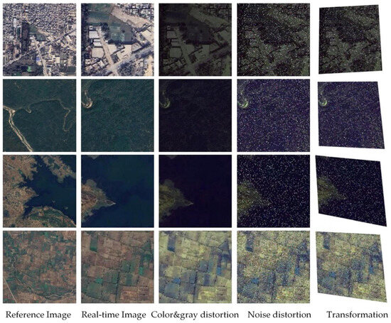 (1) Perturbation: Simulated experiments necessitate considering the discrepancies between real-time and reference imagery and establishing an effective distortion perturbation model to ensure a closer resemblance of the simulated real-time image data to practical applications. The distortion model is derived from the disparities encountered in actual matching scenarios between the reference and real-time imagery and is influenced by the specific image characteristics employed. In this study’s simulated experiments, the predominant distortion model encompasses color and grayscale distortion models, noise interference models (such as Gaussian noise, salt-and-pepper noise, and speckle noise), as well as geometric distortion models (including projection transformations). Specifically, the noise addition ratio is set at 0.01, the projection transformation ratio at 0.1, and the ratios for brightness, color, and contrast transformations at 0.1. Random coefficients are introduced for each distortion occurrence. The simulated distortion demonstration is depicted in Figure 3.