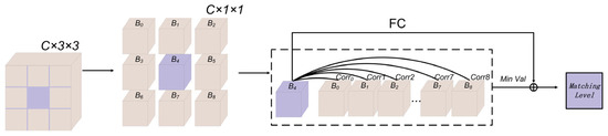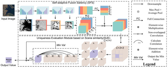 The SUE module is shown in Figure 6. The saliency feature map extracted by the previous module is passed through a non-overlapping convolutional layer with both a convolutional kernel and a step size of 25 to obtain a feature of size 3, which is used as an input to the SUE module [40]. The region is divided into a 3 × 3 grid using a sliding window approach, resulting in 3 × 3 regions with a size of 1 × 1 × C. Among them, represents the feature of the central region, while the other features represent the surrounding regions. On one hand, the feature vector of is correlated with the feature vectors of the surrounding sub-regions using the Euclidean distance as the evaluation criterion. The minimum Euclidean distance, denoted as , is considered as the global uniqueness output. A smaller Euclidean distance indicates higher similarity to the feature and lower uniqueness, while a larger Euclidean distance implies lower similarity and higher uniqueness. On the other hand, the feature is processed through a fully connected layer to output its saliency level, denoted as , in the scene. Finally, the uniqueness level and saliency level are fused using summation to obtain the matchability prediction value , which contains both saliency and uniqueness information.