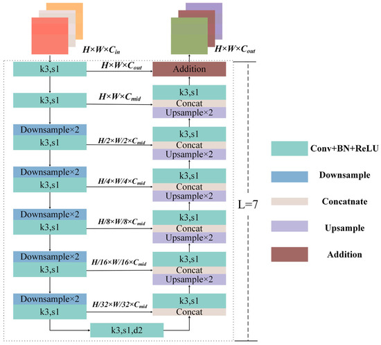 Specifically, we first utilize Residual U-Blocks (RSU) [37,38] to extract multi-scale features at each level of the feature pyramid. These features are then aggregated and fed into the Multi-level Feature Adaptive Fusion module for adaptive weight allocation and fusion, resulting in a saliency feature map. As illustrated in Figure 5, RSU is an excellent module for image saliency analysis. It incorporates residual blocks into the U-Net architecture, comprising an encoder, a decoder, and cross-layer connections. The encoder utilizes residual blocks from ResNet to extract high-level feature representations, while the decoder employs the decoding structure of U-Net [39] to restore resolution and capture detailed information. The cross-layer connections are applied in the decoder, enabling it to leverage the feature information from the encoder for improved saliency analysis accuracy.