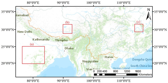 WHU-SCENE-MATCHING dataset coverage area from left to right in red boxes; (a) India region; (b) Tibet region of China; (c) Eastern Hubei region.