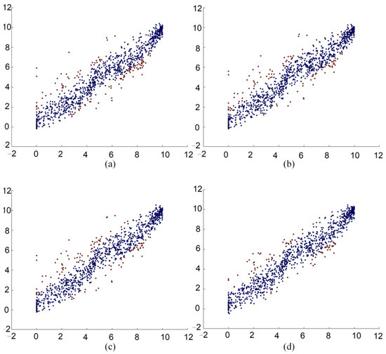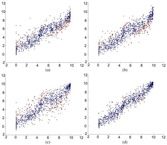 Results of the ablation experiments. (a–d) show the predicted/true distributions of RSU, RSU + SFS, RSU + SUE, and RSPNet, in that order. The blue color represents data where the difference between predicted and true magnitude is less than 1.5, and the red color represents data where the difference between predicted and true magnitude is more than 1.5.