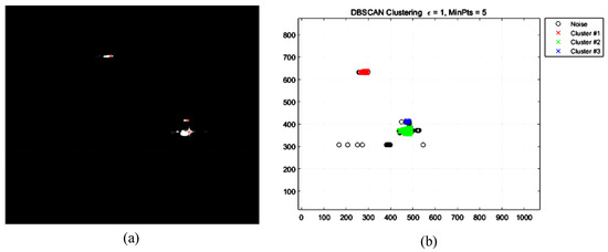 After we separated the interference of background and noise in GIU data and obtained the target image, we expect that the vessel can be accurately and automatically identified through the target image by a target detection algorithm. As mentioned in Section 2.2, several characteristics limit the application of traditional target detection methods. Firstly, the vessel’s shape, size, and brightness values in SDG data are irregular. As a result, no reliable feature can be utilized, and target detection based on these features may lead to missed detection. Secondly, since many vessels carry different light sources at different positions, many vessels are non-connected targets, which may lead to false detection. We observe that due to the artificial light diffusion phenomenon, the local density of high-brightness pixels in the target area is significantly larger, as shown in Figure 3a. Based on this feature, we can convert the highlighted pixels into objects and then use local object density clustering to complete the object detection, as shown in Figure 3b.
