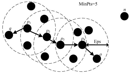 A schematic of the related concepts of DBSCAN is shown in Figure 4. Among them, are core objects; q and o are boundary objects; n is noise object; q is directly density-reachable from ; is density-reachable from ; q and o are density-connected.