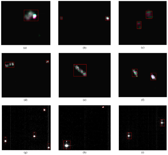 Schematic diagram of the detection results in this study’s sea areas, where (a–f) shows RGB data, and (g–o) shows HDR data. The red box denotes the detection results.