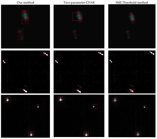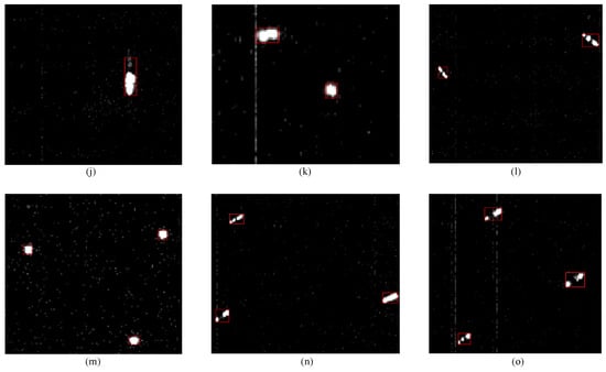The schematic diagram of the detection results in this study’s sea areas is shown in Figure 5, where the red box represents the location of the vessel determined by the detection algorithm. Figure 5 presents the data for several different cases. Here, Figure 5a–f shows RGB data, and Figure 5g–o shows HDR data. It can be seen from Figure 5 that the shapes and sizes of the vessels in these data have significant differences. Moreover, Figure 5i,l,o,n contains non-connected targets. These complex factors bring more difficulties to the detection algorithm.