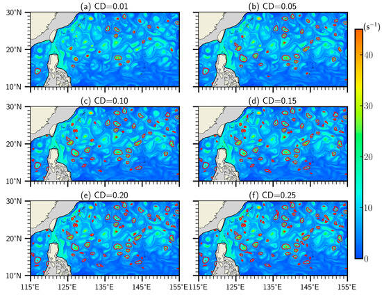 - The CD is defined as the ratio of the difference in the area between the convex hull and the contour to the area enclosed by the contour’s area [45]. Higher CD values indicate more filamentary tails and less compact geometry. And the closer CD is to zero, the closer the eddy boundary is to become a convex curve.