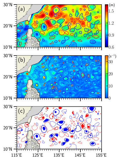 - Cheng, Y.-H.; Ho, C.-R.; Zheng, Q.; Qiu, B.; Hu, J.; Kuo, N.-J. Statistical features of eddies approaching the Kuroshio east of Taiwan Island and Luzon Island. J. Oceanogr. 2017, 73, 427–438. [Google Scholar] [CrossRef]