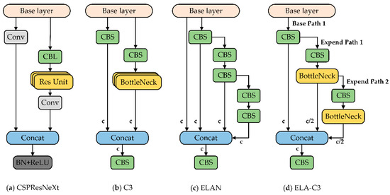 The backbone and neck focus more on obtaining efficient features, especially in lightweight models. As shown in Figure 3a,b, C3, as a variant of CSP-ResNeXt, still retains the CSP architecture and adopts CSP-Bottleneck as the modified unit with fewer parameters. In lightweight models, sharing current layer weights often achieves efficient layer aggregation. Based on this idea, we proposed a variant named Efficient Layer Aggregation of C3 (ELA-C3) in Figure 3d. In addition to reducing repetitive gradient learning, we also analyzed the gradient path. Compared to the Efficient Layer Aggregation Network (ELAN) [29], ELA-C3 removes the base layer paths with less contribution and assigns different channel numbers to different layers. For example, in Figure 3d, the number of channels in the three paths from left to right is c, c/2, and c/2, respectively. In this way, different layers can learn more various features without damaging the original gradient path, which is beneficial in enhancing learning ability.