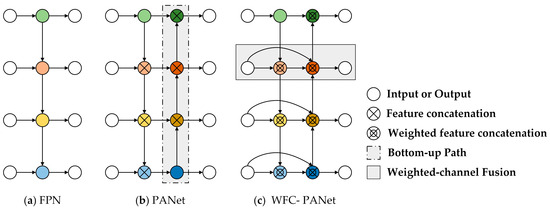 For the single-stage detector, multi-layer detection is an important method to address scale differences. As we all know, FPN has inconsistency of features among the different scales of the target. Specifically, large targets are typically associated with higher-feature maps, while small targets are typically associated with lower-feature maps. After sampling and fusion, the high-level feature responsible for large targets has rich semantic information but fuzzy spatial information. In contrast, the low-level feature responsible for small targets has an accurate location but less semantic information. This may result in a low classification accuracy for small targets and an inaccurate positioning for large targets. In Figure 4b, PANet adds a bottom-up fusion path, which is a “soft fusion” to ensure that spatial features are mapped to global features. However, not only does it bring more parameters and computational complexity, but also the loss from sampling is irreparable. For these issues, we proposed a lightweight fusion with the weighted channel based on PANet (WFC-PANet).