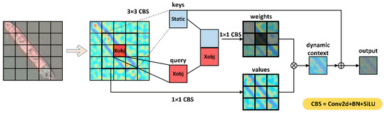 where represents the convolution with SiLU while represents the convolution without activation. Obviously, the learned attention weight matrix considers the context keys and queries. In other words, the purpose of mining contextual information is to improve the self-attention of local regions. Next, Softmax is used to form the attention weight matrix . Aggregating the value matrix, a dynamic contextual self-attention weight matrix is calculated and represented as follows: