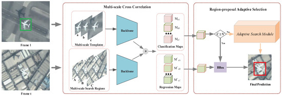 In this section, we describe the proposed SiamMAS tracking method with a multi-scale cross correlation and a region-proposal adaptive selection for remote sensing video in detail. The overall architecture is presented in Figure 2.