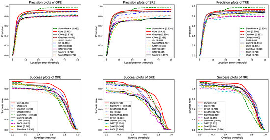 We evaluate tracker’s performance by conducting an OPE, an SRE, or a TRE based on the common evaluation metrics: mean overlap precision, the area under the curve (AUC), and FPS [70]. The mean overlap precision is related to the center location error, which is the Euclidean distance between the predicted object center and the true object center. The mean overlap precision refers to the percentage of the number of frames whose center location error is lower than a certain threshold (usually 20 pixels [9,71]) to the total number of video frames. The mean overlap precision and AUC can be reflected in the precision plot and success plot, respectively. The AUC represents the area under the curve of the success plot. In addition, the FPS can be adopted to evaluate the speed of the tracking algorithm.