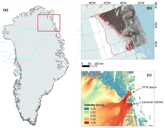 (a) Overview map of Greenland, where (b,c) are subsets of the area delineated in red in (a). (b) Closer view of the area of interest, with the spatial coverage of the utilized Sentinel-2 scenes shown, along with the region in which the model is run outlined in red. (c) Velocity map (m/year) highlighting the locations of the two glaciers of interest in this study. The ice velocity data is Sentinel-1 data from the 2019–2020 winter campaign from the ESA Ice Sheets CCI project (http://products.esa-icesheets-cci.org/products/downloadlist/IV/, last accessed on 28 February 2023).