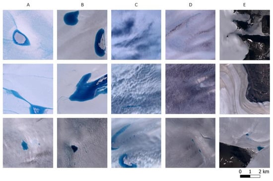 Examples of the image subsets (512 × 512 pixels) chosen for algorithm development. Each column highlights variability within certain categories: (A) lighter-colored lakes, (B) darker-colored lakes, (C) cloud shadows on the ice/snow, (D) ice/snow texture and color, and (E) surrounding rock/nunataks.