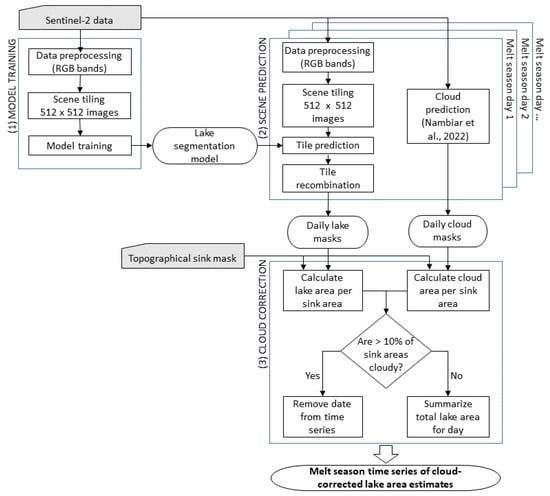 The processing chain overview for the creation of a supraglacial lake-area time series. The process is divided into three components: (1) Model training, where training data are prepared and a deep learning model is trained; (2) Scene prediction, where the time series data are prepared and both lake and cloud predictions [42] are made on a series of scenes; (3) Cloud correction, where cloudy days are identified and removed, and daily lake-area totals are calculated.
