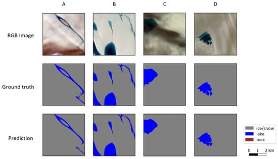 In Figure 5, four example testing images are shown, along with their manually derived ground-truth labels and the prediction labels from the model. In general, the prediction labels tend to follow the lake contours rather precisely, with only small areas of false negatives and positives. Additionally, since existing supraglacial lake segmentation algorithms tend to falsely identify shadows on ice as lakes, the testing dataset was created with a significant percentage of images containing shadows (19.15% of the entire testing dataset). Two of these images are shown here in columns A and C, demonstrating the model’s ability to differentiate between lake and shadow. Furthermore, out of all the testing images containing shadow, only three contained portions of falsely classified shadows.