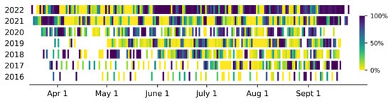 The daily percentage of cloud cover over the predefined sink areas (i.e., potential lake areas) in the 2016 to 2022 melt seasons.