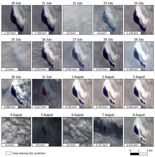 The importance of accurate cloud masks is demonstrated in Figure 7, where the time series of an example lake over a 20-day period in 2021 is shown. These daily images show the segmentation of the lake boundary from the deep learning model as well as the estimated lake area in the lower left corner. There are six days in which clouds or cloud shadows fully inhibit the identification of the lake boundary. Furthermore, there are two days, 31 July and 7 August, where only a portion of the lake is segmented due to partial cloud coverage. Without the removal of both the fully and partially cloud-covered days, the lake-area time series would appear very jumpy and it would be more difficult to determine where the actual trend lies. Figure 7 also demonstrates how dynamic an SGL can be. In less than three weeks, this lake decreases in area by roughly 62%, causing the lake to separate into three disconnected bodies of water.
