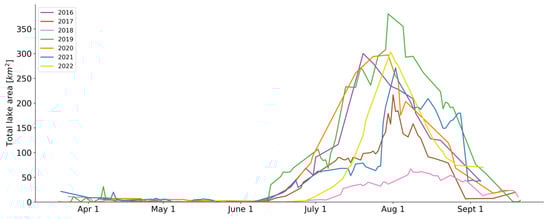 The results from the time series calculations can be seen in Figure 8, where the daily total lake area is tracked over the entire melt season for the years 2016 to 2022. In general, each melt season follows a similar trend, reaching the peak lake area around 1 August. The development progression and quantity of meltwater, however, vary strongly among the years. For example, the peak lake area for 2019 is roughly 5.6× the amount of that in 2018, due to drastically different local weather conditions, as investigated by Turton et al. [2]. Additionally, while most years begin showing significant lake development in early June, this is not apparent until early July in 2022. Furthermore, the threshold for acceptable cloud coverage was raised to 20% for 2022 (from the 10% used for the other years), due to an insufficient number of cloud-free days during the peak of the melt season.